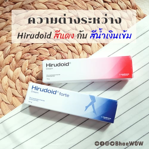 สวัสดีค่ะ เภว๊าว ว๊าวความรู้คู่สุขภาพนะคะ เพื่อนๆเคยสงสัยกันไหมว่า Hirudoid รุ่นกล่องสีแดงและกล่องสีน้ำเงินเข้ม/สีม่วง แตกต่างกันยังไง วันนี้จะมาพูดถึงความแตกต่างระหว่าง Hirudoid ทั้งสองสีกันกันนะคะ ส่วนประกอบของแต่ละตัว ฮีรูดอย (Hirudoid/Hirudoid forte) จะมีรุ่นกล่องสีแดงและกล่องสีน้ำเงินเข้ม/สีม่วง ส่วนประกอบ จะประกอบด้วยตัวยา มิวโคโพลีแซคคาไรด์ โพลีซัลเฟต (Mucopolysaccharide polysulfat
